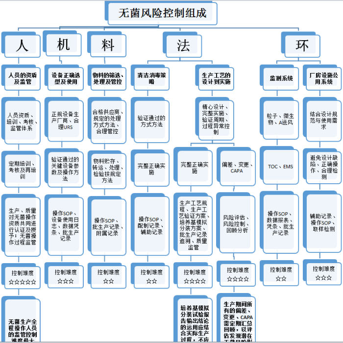 将联系无菌生产工艺生产实际,将无菌风险控制要素逐级分解,并对其进行难度系数打分(难度系数一至五星,难度依次增加)从而得出无菌控制难点,分析如下:
