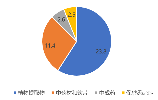 从出口商品结构看,植物提取物占比最高,主要出口美国,用于膳食补充剂和食品添加剂生产,受到贸易摩擦的影响有所波动;中药材与饮片次之,对日韩等主要市场出口持续稳定增长;最后是中成药和保健品,出口增长较为缓慢。总体呈现附加值偏低的特点。