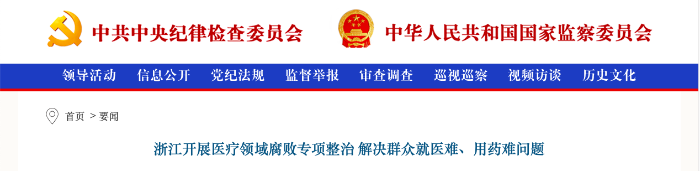 根据中纪委6月20日的一篇发布在要闻板块的文章——近日,浙江开展医疗领域腐败专项整治,浙江省纪委监委机关与省卫健委制定下发《全省医疗服务行业腐败问题专项整治工作方案》,持续纠治医疗服务行业腐败问题和不正之风。