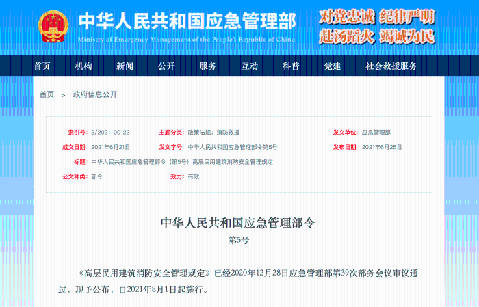 应急管理部消息,《高层民用建筑消防安全管理规定》(以下简称《规定》)近日公布,将自2021年8月1日起施行。
