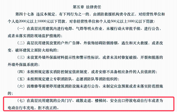 《规定》明确,违反上述规定,在高层民用建筑的公共门厅、疏散走道、楼梯间、安全出口停放电动自行车或者为电动自行车充电,拒不改正的,由消防救援机构责令改正,对经营性单位和个人处2000元以上10000元以下罚款,对非经营性单位和个人处500元以上1000元以下罚款。