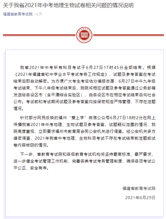 针对部分网民反映的福州“爱上学”微信公众号6月27日18时2分在网上传播福建省2021年中考地理、生物试题及参考答案,试题疑似泄露的情况,福建省教育考试院高度重视,立即要求福州市教育局会同公安机关进行调查。经公安机关多方缜密调查,2021年福建省中考地理、生物科目考试不存在考试结束前泄题或试卷内容被窃的情况。
