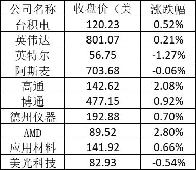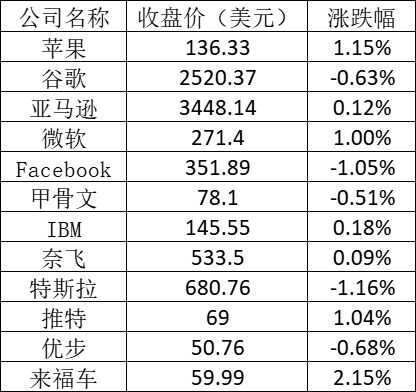 大型科技股多数上涨,苹果、亚马逊、微软和奈飞股价上涨,其中苹果和微软涨幅超过1%;谷歌和Facebook的股价下跌,其中Facebook跌幅超过1%,市值跌至1万亿美元下方。