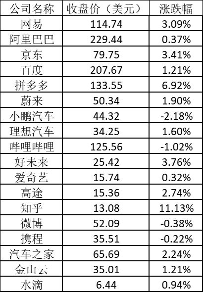中概电商股普遍上涨,阿里巴巴上涨0.37%,京东上涨3.41%,拼多多上涨6.92%。