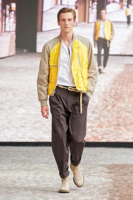 毫米级印花防撕裂科技帆布连帽派克大衣、拉链运动衫和罗纹边束腰夹克衫。在夏日里,中性的颜色选择带出一丝清凉舒适感。