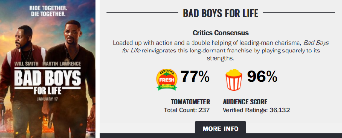 与此同时,《绝地战警:疾速追击》也同样在海外却得了不俗的成绩,从63个国外市场收获近1.7亿美元票房,上映第四周全球累计票房达到3.36亿美元,该成绩刷新了动作喜剧类系列电影的全球票房记录。有媒体评论,虽然这一部“绝地战警”中迈克·贝仅仅是以另外一种令人惊喜方式“客串”其中,但两位新人导演用事实证明了自己的实力,《绝地战警:疾速追击》无论是口碑评分还是票房成绩,都超越了前作,是当之无愧的系列最佳。