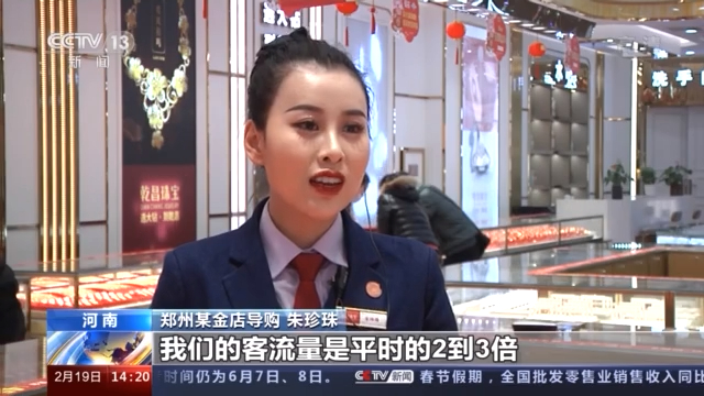 郑州某金店导购 朱珍珠:春节期间的话,我们的客流量是平时的2到3倍。基本上来看的人都会买,客单价也会比较高,单单都是几万几万的单,而且不带犹豫,喜欢就会买。