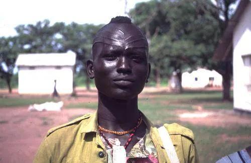 丁卡族成年男性额头上有6道长线,用刀直接刻的。