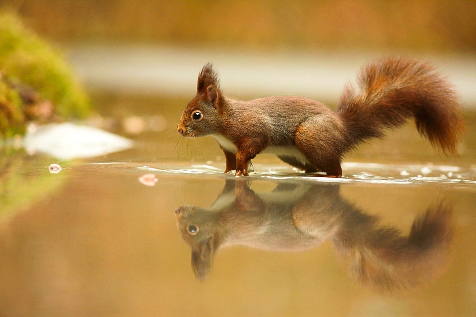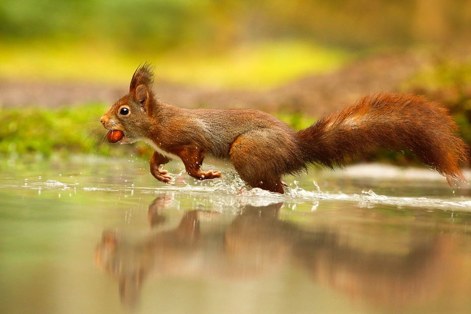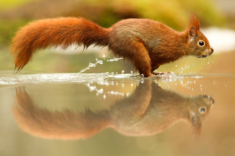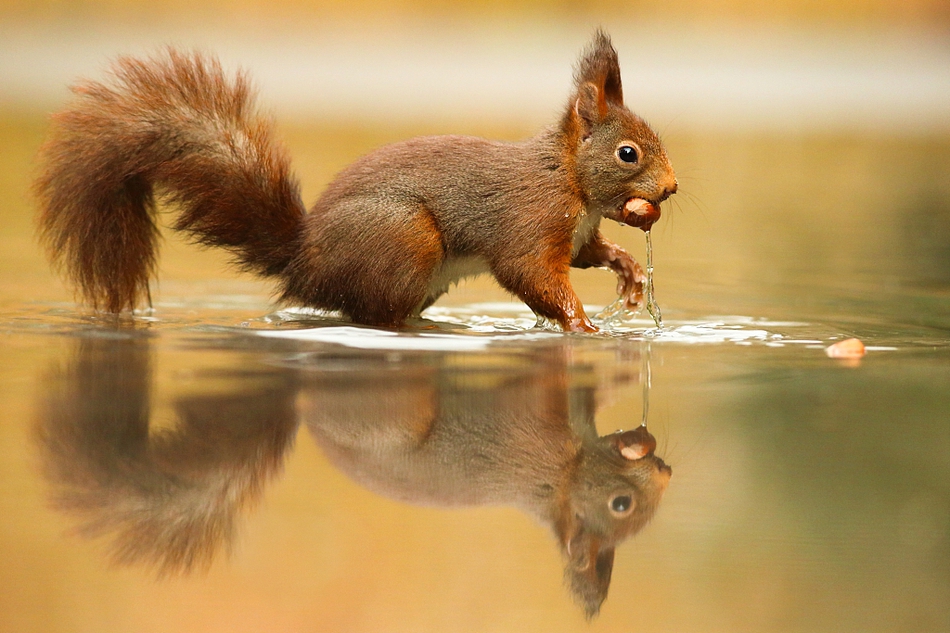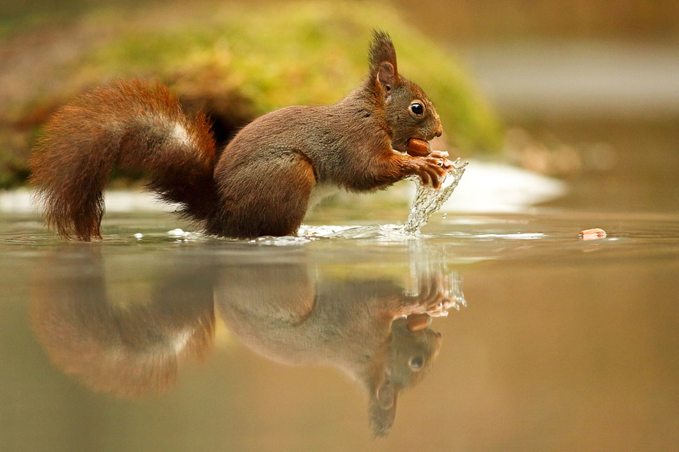 2021年3月1日讯(具体拍摄时间不详),红松鼠正在捡拾掉落的坚果,身影完美倒影在平静的池水中,并在刚刚融化的冰水中溅起水花。在经历了寒冷的冬天之后,松鼠们都非常饥饿,要么贪婪地吃掉了它们的战利品,要么把它们藏起来以备下雨天之需。